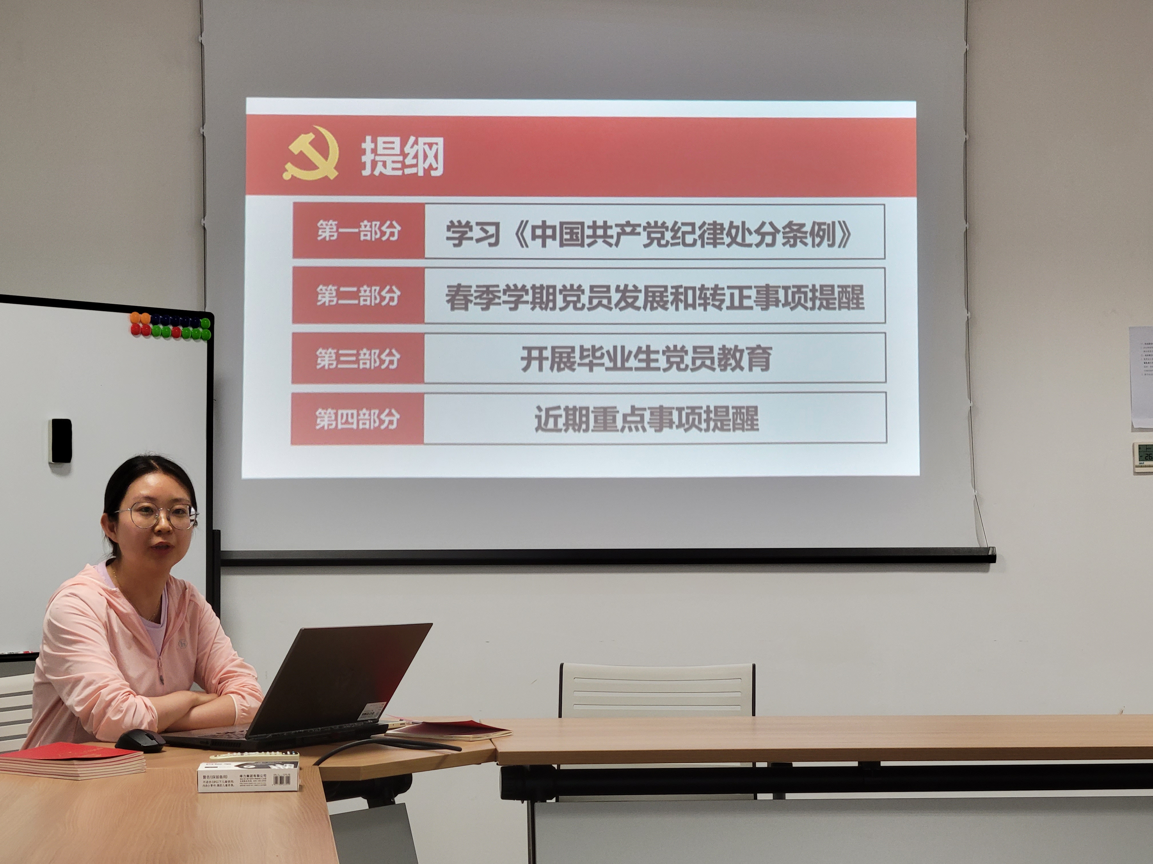 随后,石红薇老师向大家传达了春季学期党员发展转正关键时间节点及相关材料的要求。要求各支部严格审查所有阶段的入党材料,务必做到时间正确、内容无误。同时强调各支部要加强制度建设,减少制度漏洞,按照年度计划开展组织生活,积极申请党建经费支持。开展形式多样、促进真学实干的实践活动。临近毕业季,要抓好毕业生党员的组织关系转出工作,做好毕业生党员的教育管理,严把学生党员“出口关”。