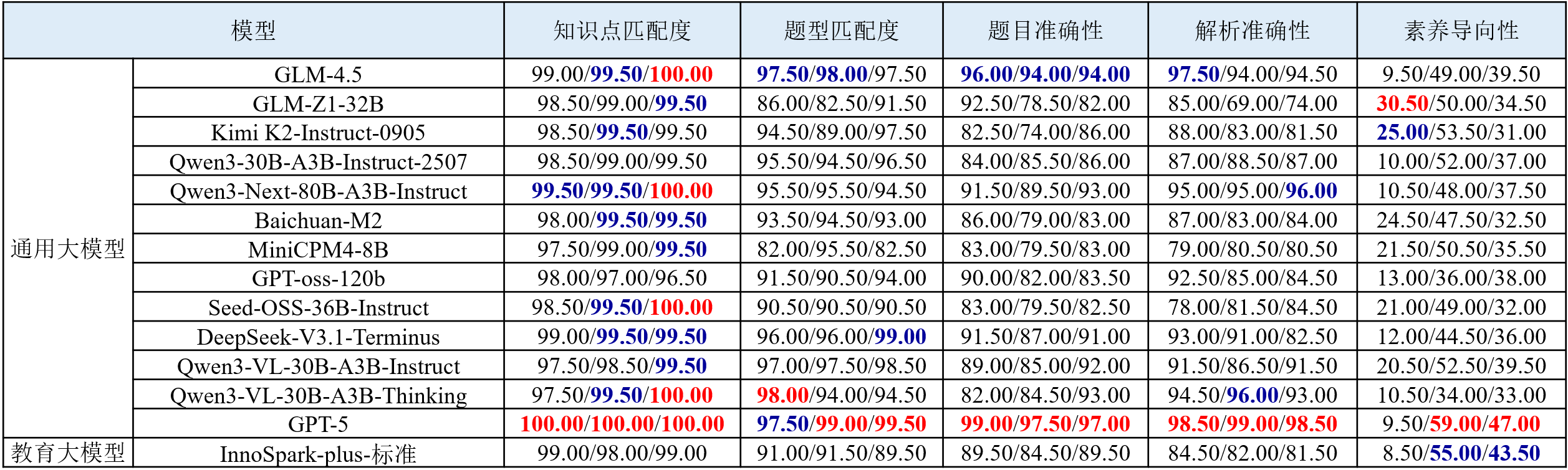 智能出题评测任务旨在从知识点匹配度、题型匹配度、题目准确性、解析准确性和素养导向性等维度全面评测大模型生成初中数学、物理和化学三门学科习题的能力。评测结果如下表所示。