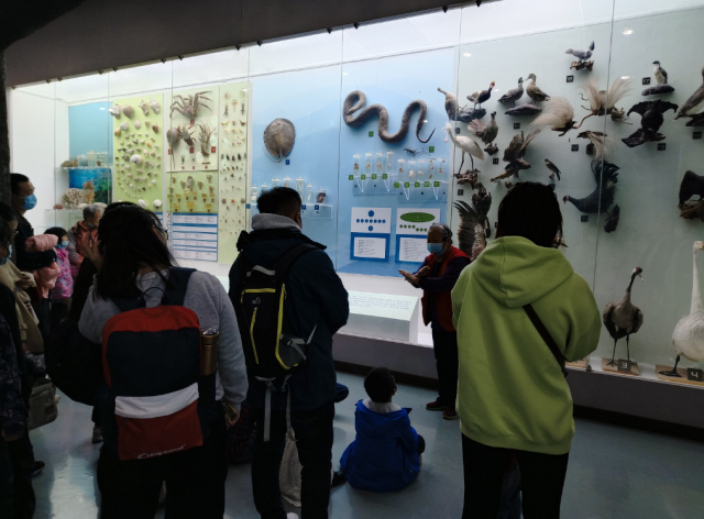 图二:同学们聆听场馆义务讲解员对不同分类标本的细致讲解